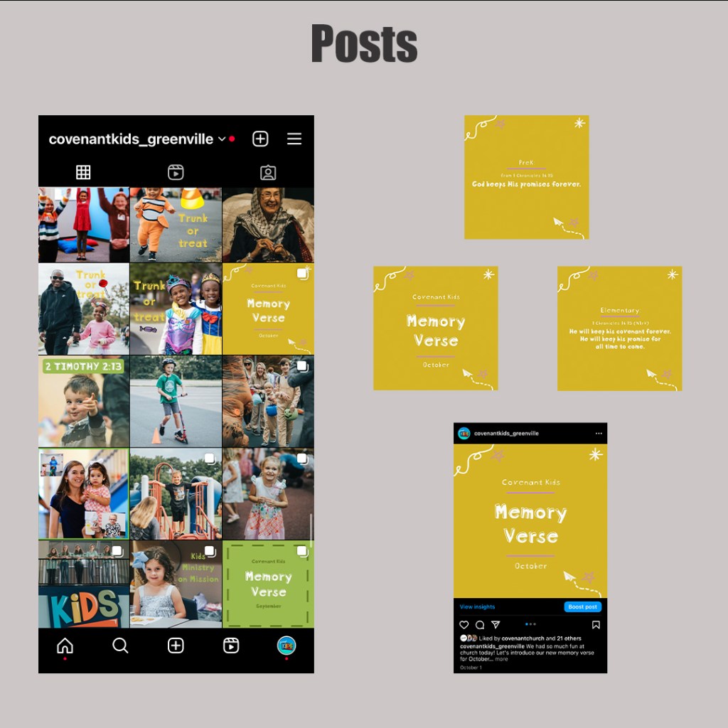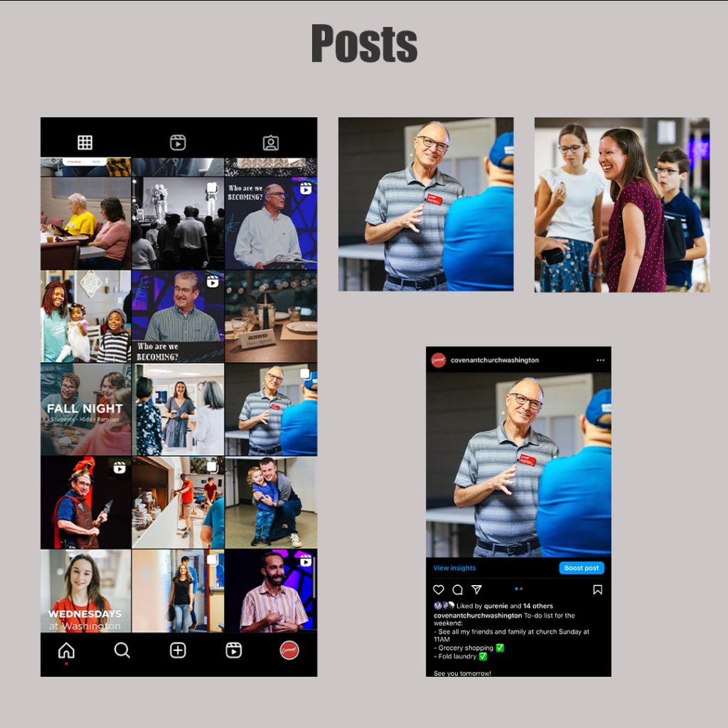 Content is across several accounts. Swipe to see examples from Covenant Church’s Main account, Covenant Student Ministry, Covenant Kids program, and Covenant Church Washington.